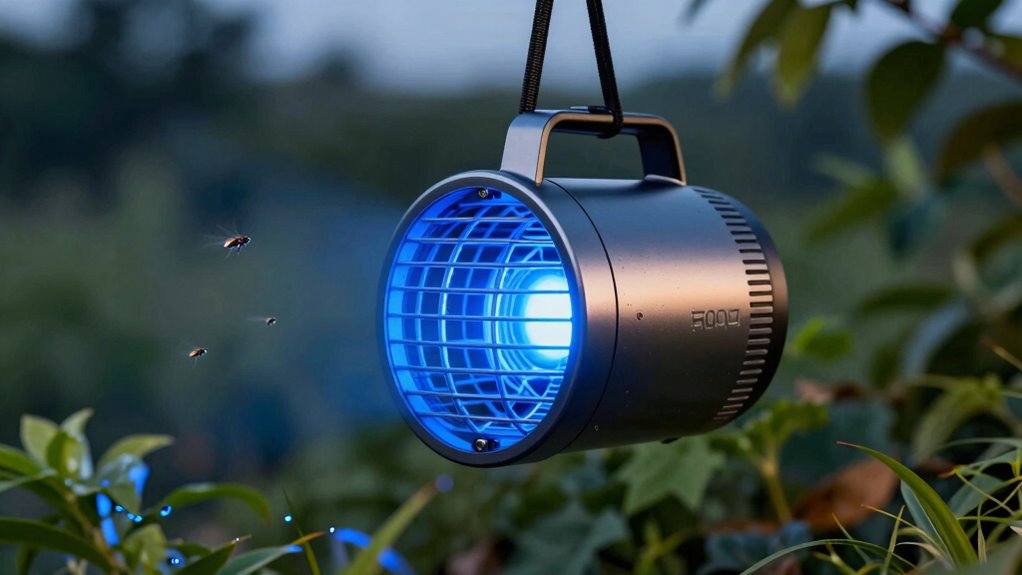 Think of the right bug zapper as a silent hero in your camping adventure. For mosquitoes, I recommend a UV light zapper with a high voltage grid, like the Dynatrap, which attracts and kills them efficiently. Flies are more stubborn, so a zapper with a fan and light combo, such as the Bug Zapper Lantern, works best. These devices target specific insects, making your outdoor experience more comfortable and bug-free.